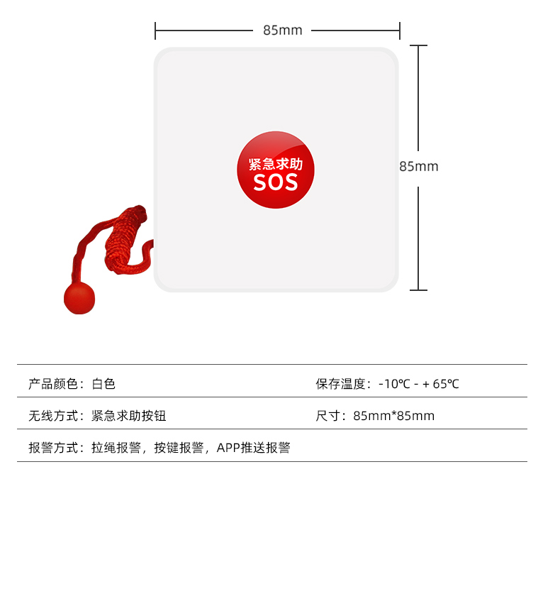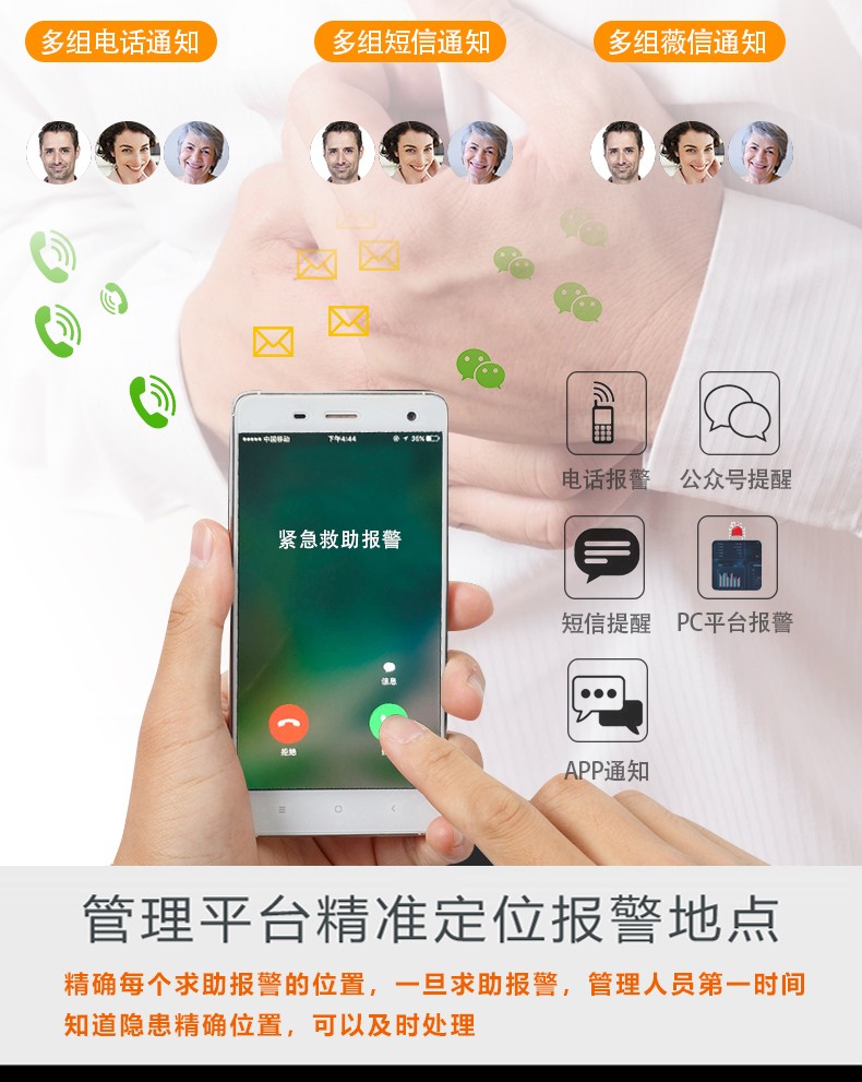 概述:老人小孩獨(dú)自在家,如遇突發(fā)事件,即可按下隨身攜帶的緊急按紐同時(shí)觸發(fā)報(bào)警,添加設(shè)備的家人手機(jī)就可收到報(bào)警消息,并在第一時(shí)間進(jìn)行處理。